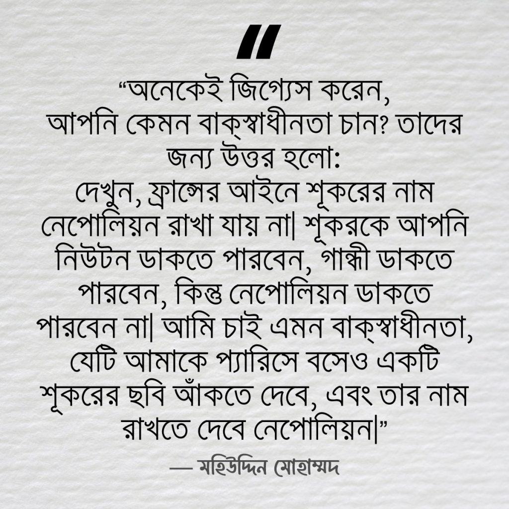 আর স্বাধীনতা হল-একজন ব্যক্তি মানুষের একান্ত নিজস্ব ইচ্ছা, অনুভূতি, বোধ, বিবেচনা, চয়েজ, টেস্ট, চাহিদা অনুযায়ী নিজের ডিসকোর্স নির্ধারনের এবং নিজের ইচ্ছাকে বাস্তবায়নের ও উপভোগ করবার এ্যাবসলুট ও এক্সক্লুসিভ অধিকার;যেই উপভোগ ও প্রতিপালন অন্য একজন ব্যক্তি মানুষ বা মানুষদের একই রকম অধিকার উপভোগে বাধা হয়ে দাড়ায় না। আশা করছি বোঝাতে পেরেছি।
